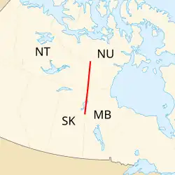 In Canada, part of the border between the Northwest Territories and Nunavut is defined by the meridian, and part of the border between Saskatchewan and Manitoba runs about 400m west of the meridian. At the 60th parallel north, these borders form a (possible) quadripoint at the four corners of these provinces and territories. 102°W is the Second Meridian of Canada's Dominion Land Survey.