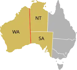 In Australia, the meridian nominally defines the eastern border of Western Australia, and the western borders of the Northern Territory and South Australia.[2] However, the border of Western Australia actually meets the Northern Territory border and South Australian border at the 26th parallel south, at what is known as Surveyor Generals Corner.[3]