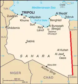 Most of the border between Libya and Egypt is defined by the meridian, as is much of the border between Libya and Sudan.[2]