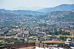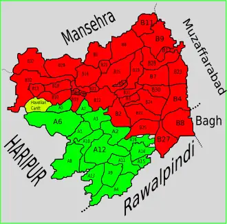 Abbottabad District (Hindko, Urdu: ضِلع ایبٹ آباد) is a district in the Khyber Pakhtunkhwa province of Pakistan. It is part of the Hazara Division and covers an area of 1,969 km2, with the city of Abbottabad being the principal town.[4] Neighbouring districts include Mansehra to the north and Haripur to the west in Khyber Pakhtunkhwa, Muzaffarabad to the east in Azad Jammu and Kashmir and Rawalpindi to the south in the Punjab province.[5] According to the 2023 Pakistani census, the population of Abbottabad district is 1,397,587 (1.39 million).