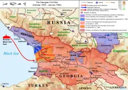 Tensions between Abkhazia and Georgia were already evident by the late 1970s, with both sides organising protests in 1978 alleging discrimination, prompting intervention by Moscow.[20] Tensions simmered throughout the 1980s, though were stoked in latter part of the decade with the advent of perestroika and glasnost under Mikhail Gorbachev, with the Abkhaz pushing for full SSR status in 1988 and ethnic riots breaking out in Sukhumi in 1989.[21][13][22][23] Thereafter Abkhaz officials unilaterally declared the area an SSR.[21] After Georgia declared independence in 1991 a compromise was brokered between Georgian President Zviad Gamsakhurdia and the Abkhaz leadership, however Gamsakhurdia was removed in a coup in 1992 and replaced with a more hardline nationalist government under Eduard Shevardnadze.[24][25] Abkhazia declared independence in August 1992 and war broke out with Georgia.[26] After fierce fighting the Abkhaz forces pushed the Georgians out of most of Abkhazia (save for the Kodori Gorge) and a ceasefire was arranged in May 1994. Roughly 8,000 people on both sides had been killed many more made refugees, with most Georgians in Abkhazia either fleeing or being forced out of the area.[13] Further clashes along the border occurred in 1998, 2001 and 2006, along with numerous other small skirmishes.[13][24]
