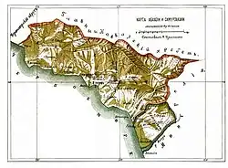 The Georgian territories were initially organised into the Georgia Governorate, then later split off as the Georgia-Imeretia Governorate from 1840–46, and finally divided into the governorates of Tiflis and Kutaisi. The northern border of these territories roughly corresponds with the modern Georgia-Russia border i.e. running along the Caucasus Mountain range. Abkhazia was formed as semi-autonomous region in 1810, with a border with Georgia set along the river Ghalizga.[4] In 1864 Abkhazia was re-designated as the 'Sukhum Military District' (from 1883 Sukhum Okrug, within Kutaisi Governorate), incorporating the Samurzakano region west of the Ingur river which had hitherto been part of Kutais governorate and had been disputed between the rulers of Abkhazia and Mingrelia.[5] Over the following decades the ethnic makeup of Abkhazia changed due to influxes of Georgian and Russian settlers.[6]