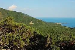 The Abrau Peninsula is the only place in Russia that harbours a Mediterranean vegetation.[1][2] The climate of the Abrau Peninsula is sub-Mediterranean with cool rainy winters without a stable snow cover and with hot dry summers. The mean annual precipitation is 500 mm, the mean July and February temperatures are 23.7 °C and 2.7 °C, respectively.[3] The area vegetation consists of three major belts:[1] (1) coastal slopes with sub-Mediterranean xerophytic forests and shrublands with pistachio (Pistacia mutica), juniper (Juniperus excelsa, J. oxycedrus, J. foetidissima), oak (Quercus pubescens) and oriental hornbeam (Carpinus orientalis); (2) piedmont and low-mountain area with a combination of mesophitic and xerophytic forests and a predominance of two oak species (Q. pubescens, Q. petraea), oriental hornbeam and junipers; (3) low mountains with mesophitic deciduous forests with a domination of oak (Q. petraea), hornbeam (Carpinus caucasica), lime (Tilia begoniifolia), maple (Acer laetum), ash (Fraxinus excelsior) and beech (Fagus orientalis).[2]
