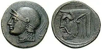 The Acarnanians were of great service in maintaining the supremacy of Athens in the western part of Greece, and they distinguished themselves particularly in 426 BC, when they gained a signal victory under the command of Demosthenes over the Peloponnesians and Ambraciots at the Battle of Olpae.[7] At the conclusion of this campaign they concluded a peace with the Ambraciots, although they still continued allies of Athens.[8] In 391 BC we find the Acarnanians engaged in war with the Achaeans, who had taken possession of Calydon in Aetolia; and as the latter were hard-pressed by the Acarnanians, they applied for aid to the Lacedaemonians (Spartans), who sent an army into Acarnania, commanded by King Agesilaus. The latter ravaged the country, but his expedition was not attended with any lasting consequences,[9] whilst the cities of Acarnania surrendered to the Lacedaemonians under Agesilaus, and continued to be Spartan allies for a time, they joined the Second Athenian League in 375 BC. The Acarnanians later sided with the Boeotians in their fight against Sparta, and with Athens against Philip II of Macedon at Chaeronea.