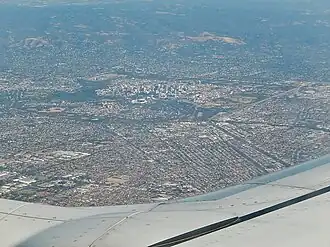 ![]() Aerial view of the Adelaide metropolitan area viewed from above the northern suburbs at the bottom of the image. The city centre is the cluster of buildings in the centre, the Adelaide Hills are centre-right, the eastern suburbs on the far left and the southern suburbs far centre. | |