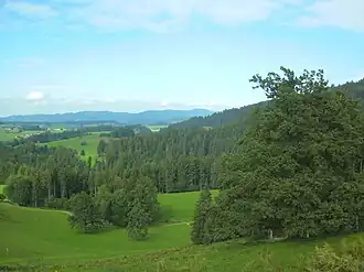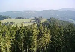 View from NE slope of the Laubenberg across the Eistobel valley and municipality of Maierhöfen looking NE towards the Adelegg | |