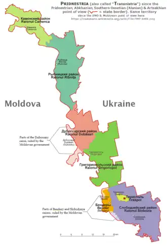 The Pridnestrovian Moldavian Republic (PMR, also known as Transnistria) is subdivided into five raions:[1]