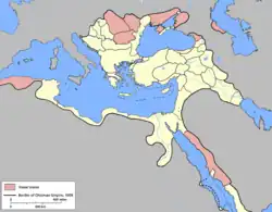 As the Empire expanded into Europe, the need for an intermediate level of administration arose and, under the rule of Murad I (r. 1359-1389), a beylerbey ("bey of beys") or governor-general was appointed to oversee Rumelia, the European part of the empire. At the end of the 14th century, a beylerbeylik was also established for Anatolia, with his capital at Kütahya.[10] He was always considered inferior in rank to the beylerbey of Rumelia, since large areas nominally under his control were given to the ruler's sons.[10]