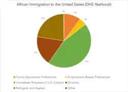 The continent of Africa has seen many changes in migrations patterns over the course of history.[9] The graph below shows African immigration to the United States in 2016 based on class of admission with numbers from the Department of Homeland Security's Yearbook.[7] The number of Black immigrants living in the United States reached 4.6 million in 2019, an increase from approximately 800,000 in 1980, and which accounted for 19% of the growth in the overall U.S. Black population. Close to 31% came to the U.S. between 2010 and 2019.[10]