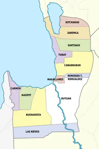 The city of Cabadbaran is the officially designated capital of the province per Republic Act 8811.[6] The highly urbanized city of Butuan is geographically within but administratively independent from the province.