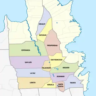 The municipalities of Loreto, La Paz, Esperanza, and San Luis are the four largest municipalities in land area comprising almost 60% of the province's total land area. Santa Josefa and Talacogon, also river towns, have the smallest land area.