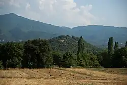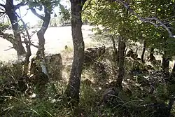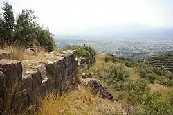 Located in the centre of ancient Ainis, the hill of Profitis Ilias (Προφήτης Ηλίας) overlooks most of the lower plains of the Spercheios and guards the pass of Giannitsou, leading north to Thessaly. A circular wall encloses the two peaks of the hill, creating a double acropolis with a shallow saddle in between.[7] Very little is still to be seen at the site; most of the circular wall is lost, the most striking part being located along the southwestern slope with several foundations of towers. Béquignon indicates that there were remains of house foundations on mainly the northern peak at the time of his visit in the 1920s.[6]