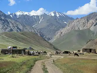 The Alay or Alai Range (Kyrgyz: Алай тоо кыркасы; Russian: Алайский хребет) is a mountain range that extends from the Tien Shan mountain range in Kyrgyzstan west into Tajikistan. It is part of the Pamir-Alay mountain system. The range runs approximately east to west.[2][3] Its highest summit is Pik Tandykul (Russian: пик Тандыкуль), reaching 5544 m.[4] It forms the southern border of the Fergana Valley, and in the south it falls steeply to the Alay Valley.[5] The southern slopes of the range drain into the Kyzylsuu or Vakhsh River, a tributary of the Amu Darya. The streams that drain the northern slopes of the range are tributaries of the Syr Darya, and empty into the Fergana Valley to the north of the range. Pik Skobeleva, 5,051 metres (16,572 ft), is also a well-known summit. European route E007: Tashkent – Kokand – Andijan – Osh – Irkeshtam crosses the range by the Taldyk Pass. The range is also traversed by Pamir highway.
