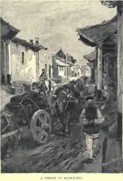 During the Qing dynasty, the town was known as Maimaicheng (Mongolian: Наймаа хот (Худалдаачин), Naimaa khot, Наймаачин (Худалдаачин), Naimaachin, Маймаа хот, imaa khot, Маймаачин, Maimaachin, etc.; Маймачен in Russian), City of Buying and Selling in English) which derived from the Chinese name Mǎimàichéng. In Mongolian, it was known as Övör Khiagt (Өвөр Хиагт, South Kyakhta).