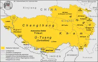 - ^ The identically-named, sparsely-populated Amdo County in the Tibet Autonomous Region (TAR) is not part of the historical Amdo province. It was directly administered by the Dalai Lama from Lhasa and is today a part of the Changtang region administered by Nagqu Prefecture in the northern part of the TAR.
