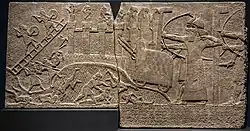 Siege engine in Assyrian relief of attack on an enemy town during the reign of Tiglath-Pileser III, 743–720 BC, from his palace at Nimrud