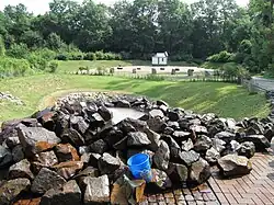 It is said that in 1903 on the Namedy peninsula, a 343 m deep borehole was drilled into a CO2-containing aquifer to extract carbon dioxide for mineral water. The reason for boring the hole at this location was that CO2 gas bubbles were seen rising in the waters of the old Rhine oxbow lake. When the cold-water geyser initially erupted, it leapt to a height of 40 metres. The geyser, and the mineral water it produced, was then called "Namedyer Sprudel" ("Namedy Fizz"). The well was initially intended for producing sparkling mineral water but soon it also became a touristic attraction. For years, the high fountain was a landmark of the Namedy peninsula. The site suffered from significant degradations over the years and in 1957 was put out of operation. Following the upgrade to the B 9 federal highway, the well was closed with a valve in 1967.[3] In the late 1990s, efforts were made to enable the geyser to become a tourist attraction again, but these conflicted with strict conservation obligations to which the area had been subject since 1985.