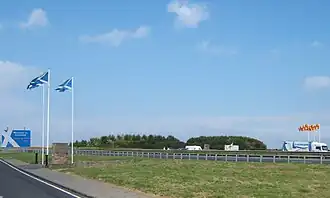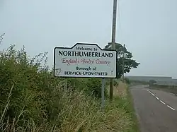 The A1 road crossing the border between Scotland and England. Entry to Scotland is marked by three Scottish saltires and entry into England is marked by three flags of Northumberland.
