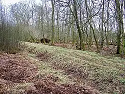The Debatable Lands lay between Scotland and England to the north of Carlisle,[16] the largest population centre being Canonbie.[17] For over three hundred years the area was effectively controlled by local clans, such as the Armstrongs, who successfully resisted any attempt by the Scottish or English governments to impose their authority.[18] In 1552 commissioners met to divide the land in two: Douglas of Drumlanrigg leading the Scots; Lord Wharton leading the English; the French ambassador acting as umpire. The Scots' Dike was built as the new frontier, with stones set up bearing the arms of England and of Scotland.[19][20]