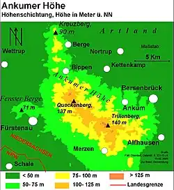 The highest elevations in the Ankum Heights are the Trillenberg, which is 140 metres (460 ft) high and is located in the southeastern part, and the Queckenberg, which has a 140 metres (460 ft) northwestern summit and a 137 metres (449 ft) southeastern peak and lies in the centre of the range.