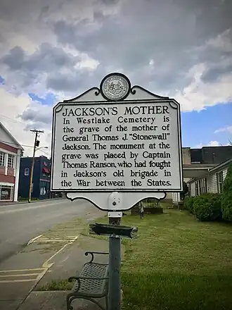 The grave of Julia Neale Jackson, mother of Confederate General Thomas Stonewall Jackson, is located in Westlake Cemetery in Ansted. The marker was placed more than 35 years after her death by Capt. Thomas Davis Ranson, one of the soldiers of the Stonewall Brigade, to mark his troops' affection for their fallen leader.