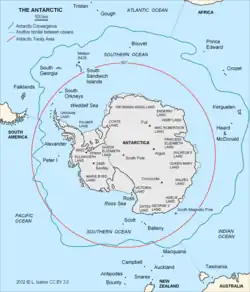 As defined by the Antarctic Treaty System, the Antarctic region is everything south of the 60°S latitude. The Treaty area covers Antarctica and the archipelagos of the Balleny Islands, Peter I Island, Scott Island, the South Orkney Islands, and the South Shetland Islands.[5] However, this area does not include the Antarctic Convergence, a transition zone where the cold waters of the Southern Ocean collide with the warmer waters of the north, forming a natural border to the region.[6] Because the Convergence changes seasonally, the Convention for the Conservation of Antarctic Marine Living Resources approximates the Convergence line by joining specified points along parallels of latitude and meridians of longitude.[7] The implementation of the convention is managed through an international commission headquartered in Hobart, Australia, by an efficient system of annual fishing quotas, licenses, and international inspectors on the fishing vessels, as well as satellite surveillance.[8]