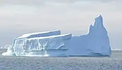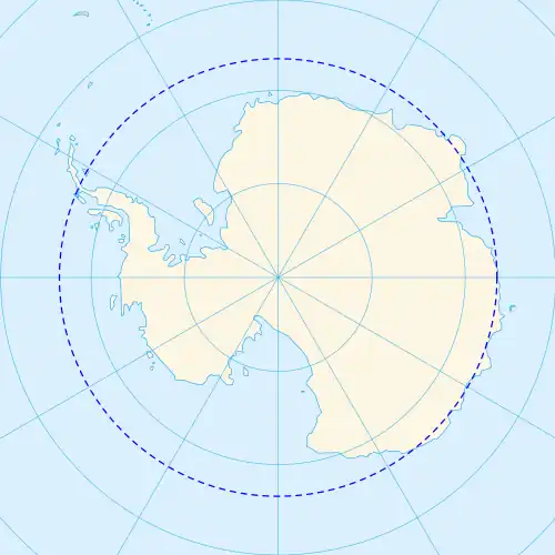 The position of the Antarctic Circle is not fixed and, not taking account of the nutation, currently runs 66°33′50.6″ south of the Equator.[1] This figure may be slightly inaccurate because it does not allow for the effects of astronomical nutation, which can be up to 10″. Its latitude depends on the Earth's axial tilt, which fluctuates within a margin of more than 2° over a 41,000-year period, due to tidal forces resulting from the orbit of the Moon.[2] Consequently, the Antarctic Circle is currently drifting southwards at a speed of about 14.5 m (48 ft) per year.