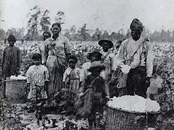 The Antebellum South saw large expansions in agriculture during the early 19th century, spurred on by increased demand for cotton for the new textile factories of the industrial North. In light of the successful cotton industry, anti-industrial and anti-urban attitudes resulting from a belief that agrarian life would continue to be the best way forward, the Southern economy experienced little industrialization or other manufacturing development.[8] The Southern economy was characterized by a low level of capital accumulation (largely slave-labor-based) and a shortage of liquid capital, which led to a South dependent on export trade. This was in contrast to the North and West, which were able to rely on their own domestic markets. Since the Southern domestic market consisted primarily of plantations focused on a few specific crops, Southern states imported sustenance commodities from the West and manufactured goods from England and the North.[9]