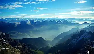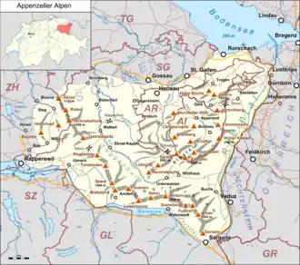 The Appenzell Alps (German: Appenzeller Alpen) are a mountain range in Switzerland on the northern edge of the Alps. They extend into the cantons of Appenzell Ausserrhoden, Appenzell Innerrhoden and St. Gallen and are bordered by the Glarus Alps to the west and the Rätikon to the south-east and cover an area of about 1800 km².[1]