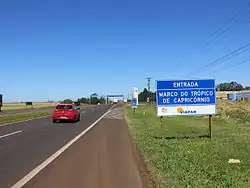 The Tropic of Capricorn is a parallel situated south of the equator and her imaginary line crosses the territory of Arapongas, in BR-369, exit to Apucarana. On site there is a composite structure of shoulders and a landmark, where travelers from different parts of Brazil and South America usually stop to register his year here, through photos and videos, or out of curiosity.[5]