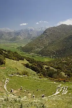 Arcadia is almost totally mountainous and part of the "carbonate platform" (calcareous or limestone deposits) of the Peloponnese. The whole peninsula was formed by intense tectonics (faults, overthrusts and regional metamorphism).[2] In Arcadia's central part around the Tripoli region developed a special form of topography, a geologically fascinating phenomenon: There are several plains and "intra mountainous basins", even "closed basins": The 30 km long "Tripoli-Plateau", "Argon Pedion", Basin of Levidi, Basin of Vlacherna Arcadia/Hotoussa/Kandila.[3]