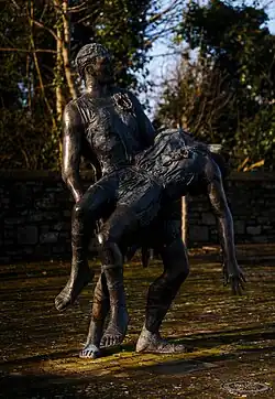 Originally called Atherdee, the town's name is from Irish: Áth Fhirdia (the Ford of Ferdia) which itself is derived from the fabled four-day battle between Cúchulainn and Ferdia, for the defence of Ulster from Queen Maeve of Connacht. It is said Ferdia fell after four days of battle, and is buried on the southern banks of the river alongside the Riverside Walk. A depiction of the pair is located on Bridge Street in the town as a bronze statue.[2][19] The River Dee was originally named in Irish: An Níth but took on the final element of the town's name in English usage.