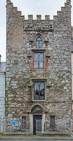 Founded a short time prior to 1487, "Chantry College" consists of a gabled tower, four storeys in height, which has an adjoining two-storey hall to the north. Although the structure was defensible, it is not classified as a fortified townhouse. It was an ecclesiastical building, and as such differs from the two castles in the town. The small section of the original building shares similarities to another surviving building in Howth, Dublin.[32]