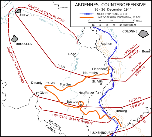 At the other end of the war, the Ardennes area came to prominence again during the Battle of the Bulge. The German Army, which had been forced to retreat for some time, launched a surprise attack in December 1944 in an attempt to recapture Antwerp and to drive a wedge between the advancing British and American forces in northern France. After a fierce battle the Allied forces blocked the German advance on the river Meuse at Dinant.
