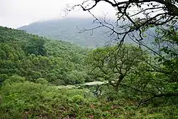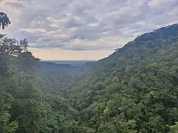 Precipitation in the region is highly seasonal and is mostly concentrated in the summer months, during which precipitation decreases from east to west.[6][11] Precipitation is distributed irregularly owing to relief.[7]: 29 As moist air reaches the eastern slopes of the mountains, this moist air raises up vertically, cooling adiabatically, leading to the formation of clouds which generate copious amounts of rain.[6] The eastern slopes of the mountains can receive between 1,000 and 1,500 mm (39 and 59 in) of precipitation a year although some places can receive 2,500 mm (98 in) of precipitation per year owing to orographic precipitation.[5][6] In the south, the orographic effect is enhanced by advancing cold fronts from the south, resulting in enhanced precipitation.[7]: 22 The high rainfall on these first slopes creates a thick jungle that extends in a narrow strip along these ranges.[9] Beyond the first slopes of the Andes into the valleys, the air descends vertically, warming adiabatically, creating air that is drier and warmer than on the eastern slopes.[6] Since the mountain ranges are oriented in a north–south direction, increase in elevation to the west,[5] and have a discontinuous orography, this allows valleys to have regions of relatively high precipitation in the west and drier regions in eastern parts of the valleys through orographic precipitation.[6][7]: 29