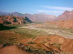 In the Quebrada de Humahuaca valley in Jujuy province, north of Jujuy city, the diurnal range is large with a thermal amplitude between 16 and 20 °C (28.8 and 36.0 °F).[14] A major reason for the large thermal amplitude is that during the day, there is intense radiation from the sun, causing the land to heat up while during the night, there is less radiation, causing the land to cool and temperatures to fall down.[14][25] Mean temperatures in the warmest month in the Quebrada de Humahuaca valley range from 15.1 °C (59.2 °F) in Humahuaca at the higher elevations to 18.5 °C (65.3 °F) in Volcan at the lower elevations; in the coldest month, the mean temperature ranges from 7.1 to 8.1 °C (44.8 to 46.6 °F).[18]: 10 The mean annual temperatures in the Quebrada de Humahuaca valley ranges from 12.0 to 14.1 °C (53.6 to 57.4 °F), depending on elevation.[18]: 10 In the Calchaquí Valleys in Salta province, the climate is similar to the valleys in La Rioja province and Catamarca province, by being temperate and arid with large thermal amplitudes, long summers, and a long frost free period which varies depending on elevation.[18]: 10 [26][27] Mean temperatures in the warmest month in the Calchaqui valleys range from 14.5 °C (58.1 °F) at the higher elevations to 22.1 °C (71.8 °F) at lower elevations; in the coldest month, the mean temperature ranges from 4.8 to 9.6 °C (40.6 to 49.3 °F).[18]: 11 The mean annual temperatures in the Calchaqui valleys ranges from 10.2 °C (50.4 °F) in La Poma at the higher elevations to 16.9 °C (62.4 °F) in San Carlos which lies at a lower elevation.[18]: 11 In both the Quebrada de Humahuaca and Calchaqui valleys, winters are cold with frosts that can occur between March and September.[12]