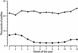 One consequence of the use of profiling floats to sample the ocean is that seasonal bias can be removed. The diagram opposite shows the count of all float profiles acquired each month by Argo south of 30°S (upper curve) from the start of the program to November 2012 compared with the same diagram for all other data available. The lower curve shows a strong annual bias with four times as many profiles being collected in austral summer than in austral winter. For the upper (Argo) plot, there is no bias apparent.