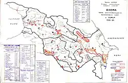 In April 1920 Russia's Red Army invaded Azerbaijan and Armenia, ending the independence of both, followed in February–March 1921 by Georgia.[27] Fighting continued however in Zangezur, where Armenian forces declared a Republic of Mountainous Armenia and continued to fight against the Bolsheviks until their defeat in July 1921.[28][29] The Soviet Kavbiuro was tasked with drawing borders between the three former republics in the Caucasus.[30] Armenian control of Zangezur was confirmed in late 1920.[31] In March 1921 Nakhchivan, despite having earlier being promised to Armenia, was allotted to Azerbaijan, partly at the insistence of the new Republic of Turkey via the Treaty of Moscow.[32][33] On 3 June 1921 the Kavbiuro decided that Nagorno-Karabakh would be included within Armenia, however disputes between the Armenian and Azerbaijani delegates over the issues continued.[34] On 4 July a final Kavbiuro meeting took place to settle the issue, which confirmed the earlier decision to include Nagorno-Karabakh within Armenia.[35] However the next day this decision was reversed and it was granted to Azerbaijan on the proviso that it was granted autonomous oblast status.[36][37] The precise reasons for the sudden volte-face remain unclear: some scholars think that Joseph Stalin influenced the decision, whereas others (such as Arsène Saparov) point to the fact that the final meeting coincided with Soviet victory in Zangezur and the defeat of the Republic of Mountainous Armenia, after which the Azerbaijanis were able to press their claims more forcefully and the Soviets had little incentive to appease the Armenian side.[37] Also in the period of 1921-1922 districts of Kazah, Akstafa and partially the district of Tauz were part of Armenian SSR[38][39][40][41]