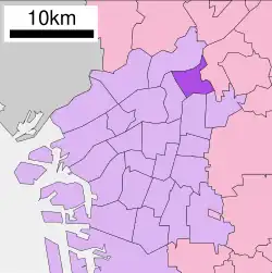 Asahi (旭区, Asahi-ku) is one of 24 wards of Osaka, Japan. It is located in the northeast of the city, near the satellite town of Moriguchi. It was split off from Higashinari in 1932. Asahi-ku itself is further divided into the following areas (towns); Shimizu, Morishoji, Omiya, Nakamiya, Takadono, Akagawa, Ikue, Shinmori, Senbayashi, Taishibashi, and Imaichi.