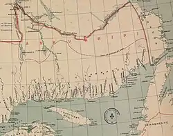 When Canada purchased the territory of Rupert's Land from the Hudson's Bay Company in 1870, the potential for territorial expansion northwards became available to the Quebec government. During a session held on April 8, 1885, the Legislative Assembly of Quebec devised a special committee with regards to the potential expansion of the border into the north. The borders that were devised by the committee were adopted by both the Parliament of Quebec and the Parliament of Canada in 1898 as the Boundaries Extension Acts of 1898. In the provisions of An Act respecting the territories of Abittibi, Mistassini and Ashuanipi of 1899, the newly annexed northern territory was divided into three regions.[2] The act decreed that the lands of Abitibi and Mistassini would be annexed alongside it.[5][4] The area that was claimed remained poorly defined at its eastern frontier, running alongside the Dominion of Newfoundland's claim, whose border was also poorly defined at the time.[6] During its existence as a territory of Quebec, for judicial and registration purposes, the territory of Ashuanipi formed a part of the historical county of Saguenay.[3]