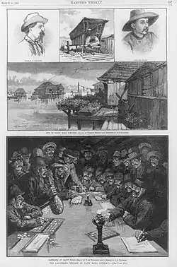 The first major wave of Asian immigration to the continental United States occurred primarily on the West Coast during the California Gold Rush, starting in the 1850s. Whereas, Chinese immigrants numbered less than 400 in 1848 and 25,000 by 1852.[13] Most Chinese immigrants in California, which they called Gam Saan ("Gold Mountain"), were also from the Guangdong province; they sought sanctuary from conflicts such as the Opium Wars and ensuing economic instability, and hoped to earn wealth to send back to their families.[14] As in Hawaii, many capitalists in California and elsewhere (including as far as North Adams, Massachusetts[15]) sought Asian immigrants to fill an increasing demand for labor in gold mines, factories, and on the Transcontinental Railroad. Some plantation owners in the South sought Chinese labor as a cheap means to replace the free labor of slavery.[16] Chinese laborers generally arrived in California with the help of brokers in Hong Kong and other ports under the credit-ticket system, where they would pay back money loaned from brokers with their wages upon arrival.[17] In addition to laborers, merchants also migrated from China, opening businesses and stores, including those that would form the beginnings of China towns.[18]