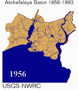 The control of the river's floods, along with those of the Mississippi River, has become a controversial issue in recent decades. The US Geological Survey (USGS) reports that Mississippi River delta salt marshes are wetlands degrading at a rate of 29 square miles per year (2.4 km2/Ms).[10] The Atchafalaya River Deltas are the only locations of land growth along the Louisiana Gulf Coast.