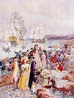 Despite reoccurring wars and conflicts, Britain acquiesced to France's demands for continuing access to this fishery.[21] Between 1755 and 1764 during the Seven Years' War the British forcibly removed thousands of Acadians from Nova Scotia and New Brunswick in an event known as the Great Expulsion or Le Grand Dérangement.[25][26] Following the Seven Years War and the Treaty of Paris of 1763, Newfoundland's governor, Admiral Hugh Palliser, consolidated British control by carrying out the first systematic hydrographic charting of the island,[27] including the Bay of Islands and Humber Arm, much of it by the Royal Naval officer James Cook.[20][28][29]
