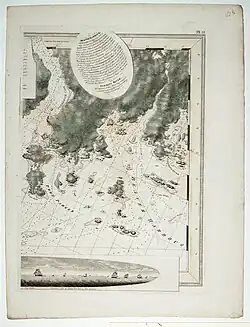 Des Barres made many maps of the Atlantic, mapping the coast of North America from Newfoundland to New York. His survey of the coast of Nova Scotia took approximately ten years due its length and intricacy. Des Barres was exasperated with the work stating "There is scarcely any known shore so much intersected with Bays, Harbours, and Creeks as this is ... and the Offing of it is so full of Islands, Rocks, and Shoals as are almost innumerable."[2] The survey work was carried out in the summer and in the winter he would retire to his estate, Castle Frederick, in Falmouth, Nova Scotia to complete his charts and drawings. In 1774 under direction for the British Admiralty, Des Barres compiled and edited his and many others' charts and maps of eastern North America. The completed work Atlantic Neptune was published in 1777, having cost the Admiralty an estimated £100,000.[3]