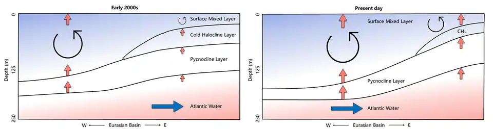 However observations show a regime shift from winter sea ice cover to open water in the southern Barents Sea in response to the warming of the inflowing Atlantic water.[9] Observations also reveal the increasing influence of Atlantic water heat further to the east, in the eastern Eurasian Basin, where in recent years the heat flux from the Atlantic water towards the surface has overtaken the atmospheric contribution in this region.[12] Furthermore, an observed weakening of the halocline over this period coincided increasing wind driven upper ocean currents, pointing to increased mixing.[13]