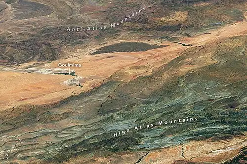 The Anti-Atlas extends from the Atlantic Ocean in the southwest of Morocco toward the northeast to the heights of Ouarzazate and further east to the city of Tafilalt (altogether a distance of approximately 500 kilometres or 300 miles). In the south it borders the Sahara. The easternmost point of the anti-Atlas is the Jbel Saghro range and its northern boundary is flanked by sections of the High Atlas range. It includes the Djebel Siroua, a massif of volcanic origin with the highest summit of the range at 3,304 m. The Jebel Bani is a much lower range running along the southern side of the Anti Atlas.[9]