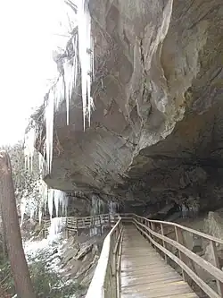 The park is a hilly, secondary forest area bisected by the Middle Fork River. The deep pools, large, flat rocks, and riverside beach have provided generations of campers, local teens and college students a place to swim or work on their tans.[5] Audra State Park is the site of Alum Cave, which is accessible by a boardwalk built along this overhanging sandstone ledge.