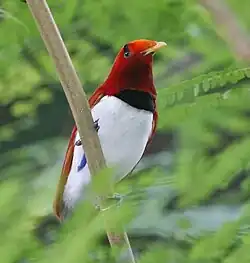Due to the spread of animals, fungi and plants across the single Pleistocene landmass the separate lands have a related biota.[94] There are over 300 bird species in West Papua, of which at least 20 are unique to the ecoregion, and some live only in very restricted areas. These include the grey-banded munia, Vogelkop bowerbird, and the king bird-of-paradise.[95]