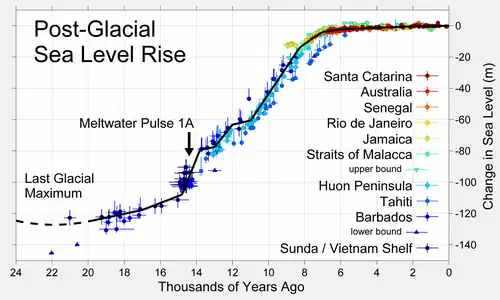 For most of the time since then, Australia–New Guinea remained a continuous landmass. When the last glacial period ended in about 10,000 BC, rising sea levels formed Bass Strait, separating Tasmania from the mainland. Then between about 8,000 and 6,500 BC, the lowlands in the north were flooded by the sea, separating the Aru Islands, mainland Australia, New Guinea, and Tasmania.