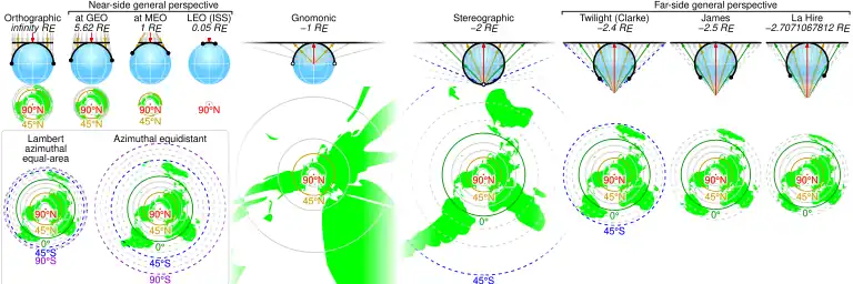 Comparison of the Azimuthal equidistant projection and some azimuthal projections centred on 90° N at the same scale, ordered by projection altitude in Earth radii. (click for detail)